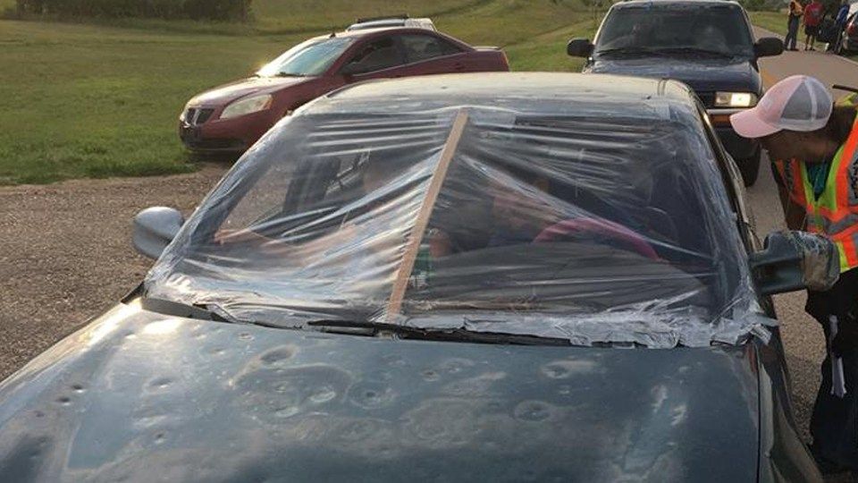 The Nebraska State Patrol is reminding drivers that they can't use a sheet of clear plastic...or a piece of wood...or duct tape...or carrots to replace a broken windshield.